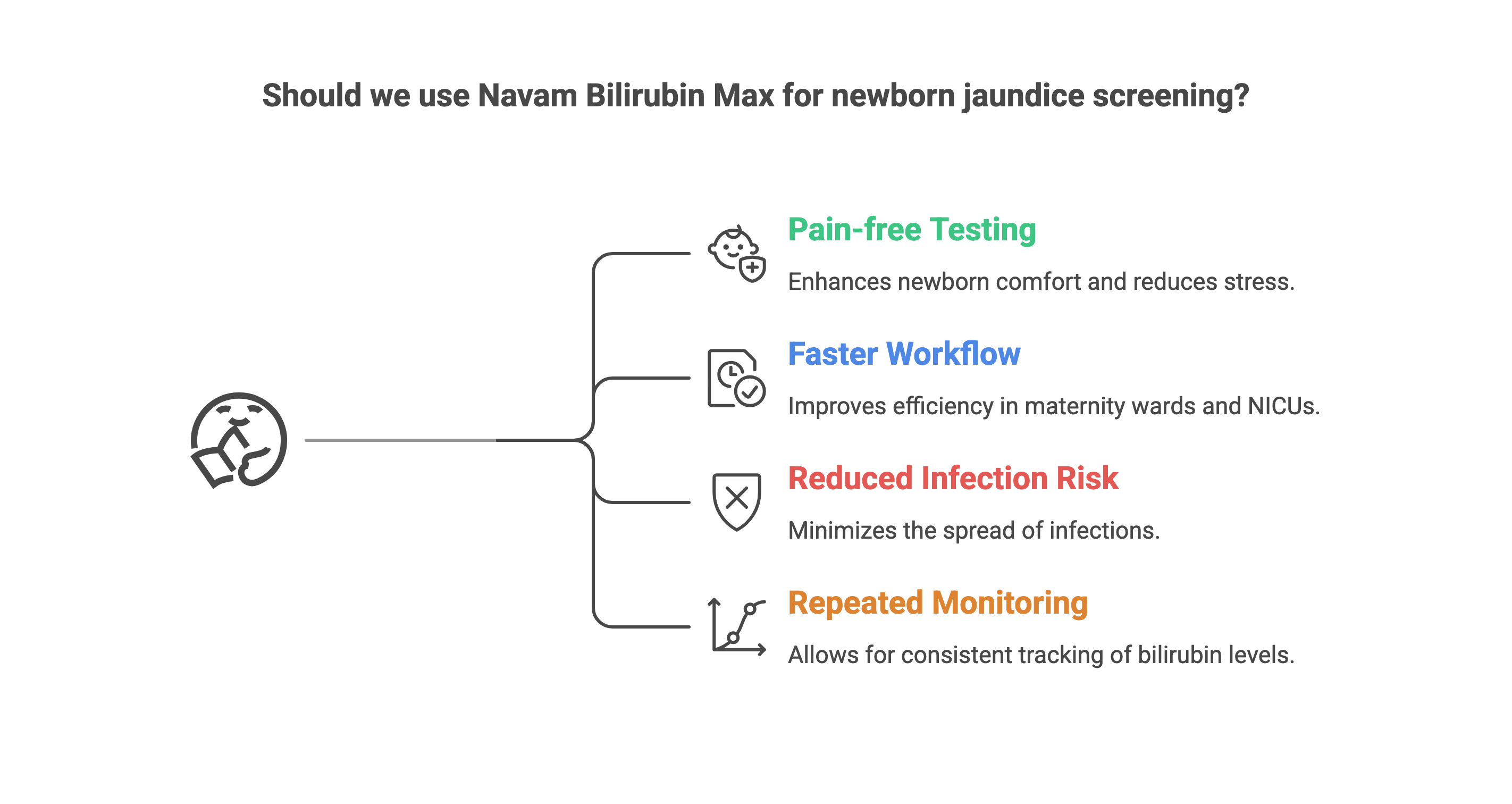 Navam Bilirubin Max is a non-invasive bilirubinometer that improves newborn comfort while maintaining clinical accuracy. It supports consistent jaundice screening in maternity wards and NICUs.