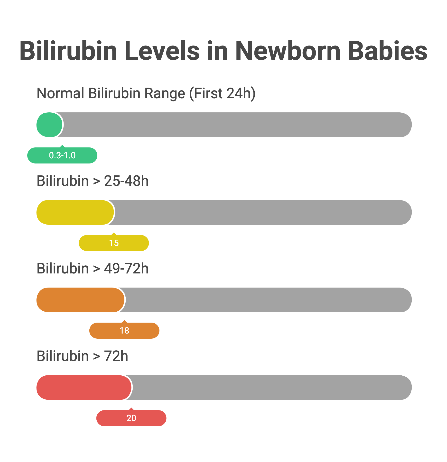 The normal bilirubin range in newborns during the first 24 hours after birth is 0.3 mg/dL to 1.0 mg/dL. When bilirubin levels exceed safe thresholds, treatment such as phototherapy may be required.