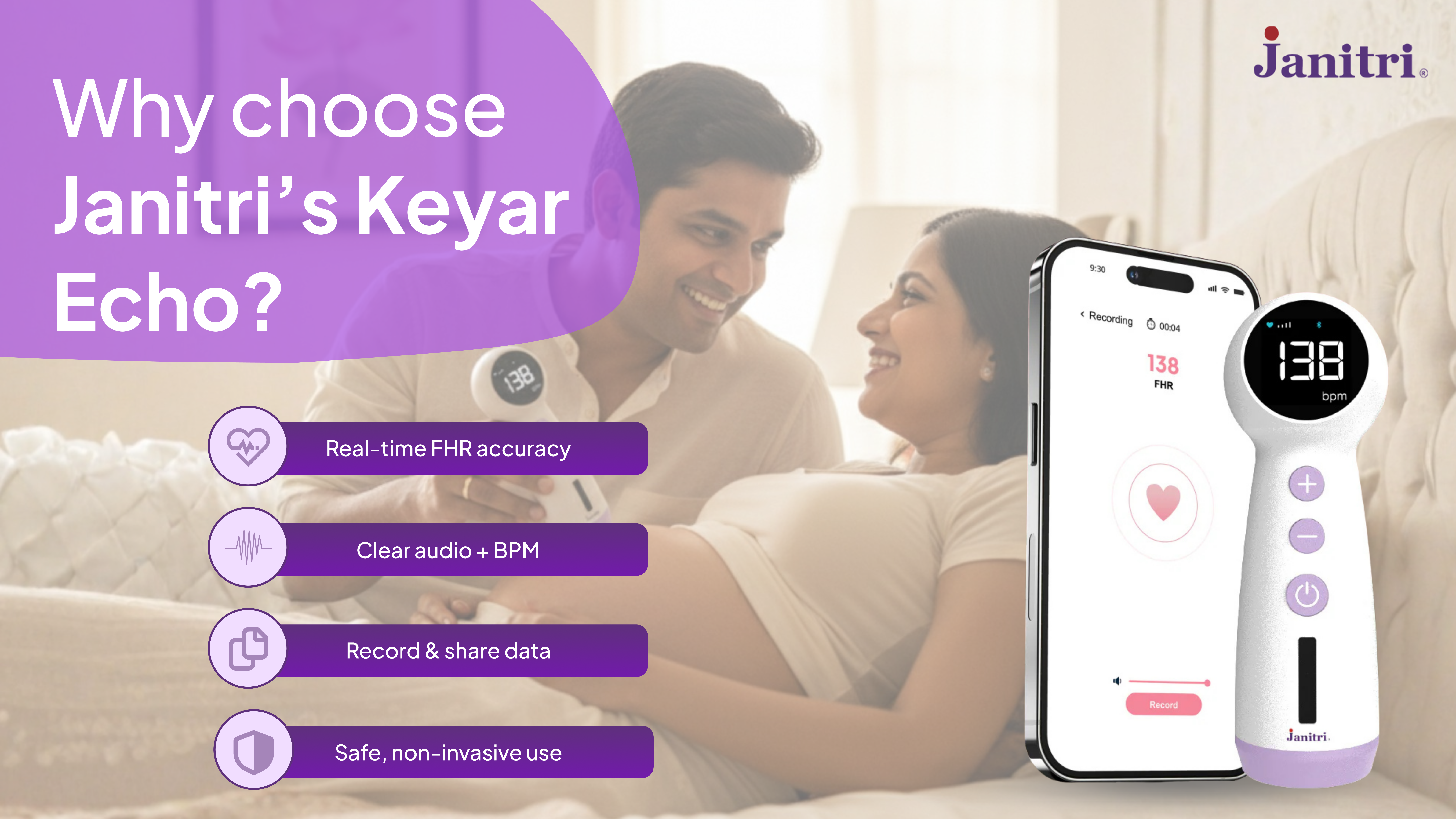Pregnancy often brings moments of uncertainty, especially between scheduled check-ups. Keyar Echo is designed to support parents during those moments; simply, gently, and responsibly. Developed by Janitri, a brand trusted in clinical maternal monitoring, Keyar Echo brings that same credibility into safe and comfortable home use.