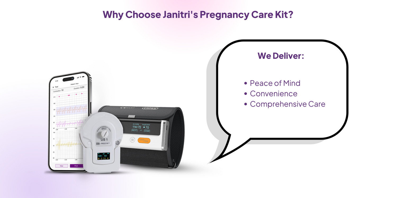 Pregnancy should be a time of joy, not constant worry. With Janitri's Pregnancy Care Kit, you can take control of your health and your baby's well-being, transforming anxiety into confidence. Our innovative combination of home BP monitoring and advanced NST technology brings professional-grade care right to your doorstep.